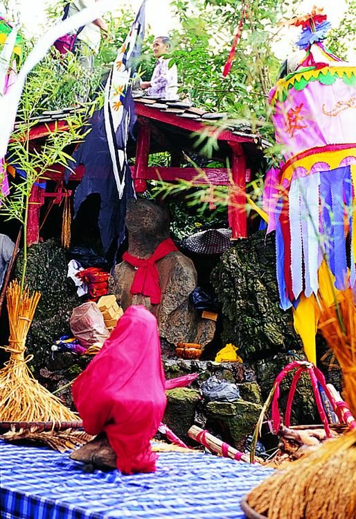 敬霞儀式在霞堂舉行。霞堂設(shè)有祭壇。壇前立著一根竹竿,竿頂上站立一只公雞。祭壇中是主祭席,其友有用松針鋪成十二個祭祀點,由宗族各支系擺設(shè)祭品。敬霞這天,各支系由德高望眾者領(lǐng)隊。抬著豬肉、糯米飯、米酒等食品列隊進入霞堂。一路上銅鼓、銅鑼、欽、革鼓被敲得冬嚏冬嚓地響,人們跟在后面吆喝著前進。祭典開始,鑼鼓暄天。接著由執(zhí)壇的水書先生念讀敬霞的祝詞,內(nèi)容多為祈福禳災(zāi),期冀風(fēng)調(diào)雨順,人壽年豐之類。祝詞之后便酪酒祭之:此后,由兩個身穿白衣的小伙子抬一母豬到田壩中繞行,后面那位不時用松針刺戳豬的尾部,使它發(fā)出嗥叫聲。圍觀的人常常發(fā)出哄笑,并且盡情地用竹片屏水和撮稀泥向抬豬者灑淋過去。走過霞堂之后,抬豬者丟下母豬,故意穿進圍觀的人群,嚇得人們四處躲避。這種逗趣結(jié)束之后,水書先生再度念讀咒詞,當(dāng)他手中的執(zhí)法彩杖一揮時,飼雞者便學(xué)雞嗚,逗引竹竿頂上的公雞啼鳴。這時,主祭者就向眾人高呼:等待霞神降雨來沐浴。此后,水書先生再念祝詞,又酹酒祭之。然后由各族系代表抬著"酒壇去澆灌"霞神"。人們用酒從頭澆到腳,一直澆到"霞神"們倒(象征酒醉)才算祭祀的成功。