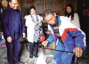 在村里修復(fù)舊屋的趙貢彩接到游客電話,馬不停蹄地趕回家中,自家手工制作的苕粉成了游客心心念念的香餑餑。拿出早已生銹的秤桿,一袋袋苕粉被游客搶著購買?!岸际橇糁约页缘模南胫苜u出去喲。”笑著說罷,趙貢彩拿出手機,微信一掃,錢款立即到賬。