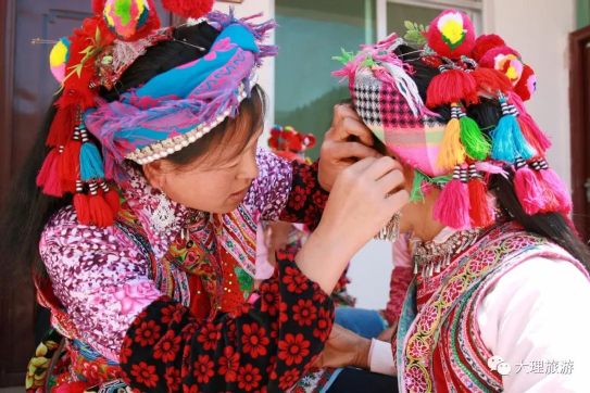踏歌會(huì)上,來自彌渡彝族聚居地的各村各寨男女老幼穿戴整齊,云集在鐵柱廟,這里便形成了五彩斑斕的彝族服飾比賽場(chǎng),每位彝族婦女的頭飾就是她心靈手巧的見證。