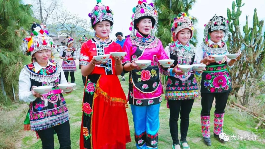 男子頭頂氈帽(又稱氈窩),穿大襟衣、大襠褲,赤足或穿草鞋,披羊皮,外出背皮袋(現(xiàn)已基本消失)。女子裹高包頭、額上飾銀桂花,衣為布襟,外套坎肩,腰系大圍腰,大圍腰左右下三邊繡五色花,為動(dòng)植物圖案,足穿繡花鳳頭鞋,用本地產(chǎn)綠布條制褲子,不鎖腳邊,腰間背圓形白氈裹背,所穿服飾顏色鮮艷、質(zhì)地厚重,盡顯遠(yuǎn)古南詔皇室服飾遺風(fēng)。