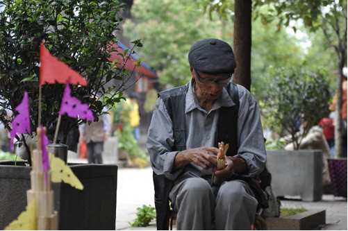 早上十點左右,火把就快扎好了。色彩鮮艷的紙裱斗升上各色卷著的彩旗正一個個被打開,梨、蘋果、花紅正被栓成一串串地掛在樹枝上,水泥桌上擺著小旗、炒蠶豆和糖果等,老人們在一旁邊笑邊聊,一盤彩色米干在燦爛的笑著。
