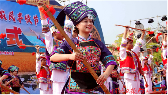 都安瑤族自治縣群眾打起扁擔(dān),歡慶“中國(guó)農(nóng)民豐收節(jié)”。