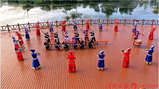 都安各族群眾在澄江國(guó)家濕地公園為游客表演打扁擔(dān)。