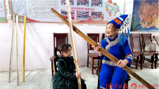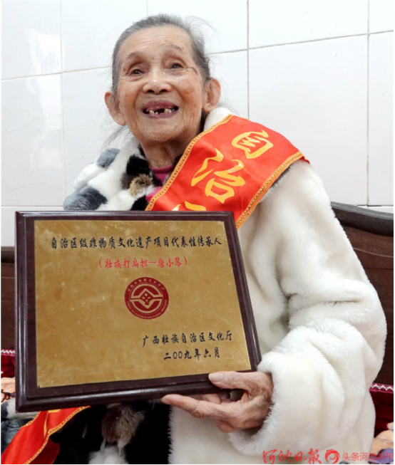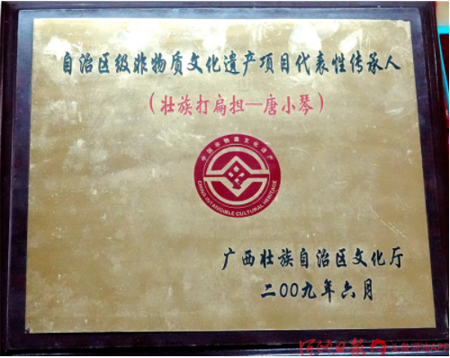 今年已經(jīng)88歲高齡的“壯族打扁擔(dān)”技藝傳承人唐小琴,她從小即耳濡目染,跟村里老人、長(zhǎng)者學(xué)習(xí)打扁擔(dān),后因打扁擔(dān)需要指揮,又學(xué)習(xí)皮鼓打法。1961年4月,唐小琴?gòu)膶W(xué)校調(diào)入縣文化館任文化藝術(shù)輔導(dǎo)員,挖掘整理了《壯族打扁擔(dān)》《板凳舞》《斑鳩舞》等一大批傳統(tǒng)舞蹈,并多次在自治區(qū)、河池地區(qū)的比賽、調(diào)演上獲獎(jiǎng)。1986年退休后,仍然致力于《壯族打扁擔(dān)》的傳承工作,2004年,組建都安縣老干康樂藝術(shù)團(tuán),帶動(dòng)安陽(yáng)鎮(zhèn)退休老人學(xué)習(xí)打扁擔(dān)技藝。2009年,她被確認(rèn)為自治區(qū)非物質(zhì)文物遺產(chǎn)項(xiàng)目“壯族打扁擔(dān)”代表性傳承人。