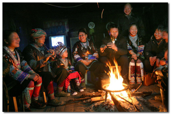 苗族起木樓很注重火塘的設(shè)置,特別留出二樓正中的大半廂作火塘?;鹛劣脤捄窭仙寄景彖傊瞥梢粋€(gè)長(zhǎng)寬約一點(diǎn)五米,深約六十公分的正方形木槽,槽內(nèi)用粘性強(qiáng)的黃泥巴填滿舂緊,正中央安放有三腳鐵架,用于架鍋煮食?;鹛潦侵笫场⑦M(jìn)餐、取暖、會(huì)客、議事、祭祀的地方,又是年輕人走妹行歌、談情說(shuō)愛(ài)、舉行婚禮儀式的場(chǎng)所。因此苗家人對(duì)火塘是十分看重的。