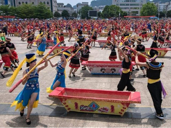 打榔舞,是崇左市天等縣的壯族傳統(tǒng)民俗舞蹈,用于酬神、還愿、祭祀、娛樂(lè)等活動(dòng),起源于唐代武德年間。打榔舞主要道具為木榔,音樂(lè)響起后,每人用一米多長(zhǎng)的木杵有節(jié)奏的敲擊榔壁、榔底和榔邊,動(dòng)作歡快有力,以此來(lái)表達(dá)壯族人民對(duì)五谷豐登、六畜興旺、幸福吉祥的祈求和渴望。表演者不分男女老少,有二人對(duì)打、四人對(duì)打、多人交錯(cuò)對(duì)打等多種方式。