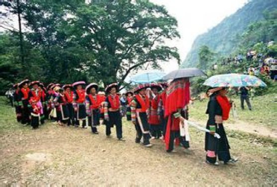 這里的"女婚男嫁"特點(diǎn),大體上有這么幾個(gè)階段。當(dāng)男女青年都長(zhǎng)到18歲后,就開始講究修飾,喬裝打扮一新,女青年似花蕊朵朵,男青年個(gè)個(gè)英俊瀟灑。通過趕街、走親訪友、耍老表、節(jié)假日唱山歌,打陀螺,拋毽子等方式,進(jìn)行談情說愛,互相了解,這是認(rèn)識(shí)階段。在認(rèn)識(shí)基礎(chǔ)上,雙方互請(qǐng)到家做客,彼此進(jìn)一步掌握對(duì)方為人、性格,家庭成員,家庭經(jīng)濟(jì)等情況。這是加深認(rèn)識(shí)、了解、建立愛慕之情階段。每逢農(nóng)忙季節(jié)和節(jié)假日,女方總要請(qǐng)男方來幫助犁地、耙田,耕種,收割,蓋房子等,這是考察對(duì)方勤勞能干還是好逸惡勞階段,是最關(guān)鍵的階段經(jīng)過一兩年的交往接觸,雙方產(chǎn)生了深厚感情,女方就偷偷買布,精心地打好精致的布鞋送給男方,男方收到信物后,就選擇買手鐲、頭簪、戒指,耳環(huán)或手表等其中的一兩件送給女方,彼此作為定情物,確定自己的心上人。但是,這些交往仍然是在秘密的條件下進(jìn)行,屬保密階段。經(jīng)過以上四個(gè)階段以后,女方便請(qǐng)男方派老人帶上幾斤酒,糖,一些煙餅等禮品來訂親,要求上門,將婚事公布于眾,從這以后,女方就負(fù)責(zé)籌備一切嫁妝、床上用品、家具等。待東西備齊,女方就擇日接男方過門。