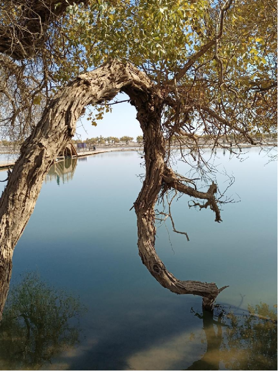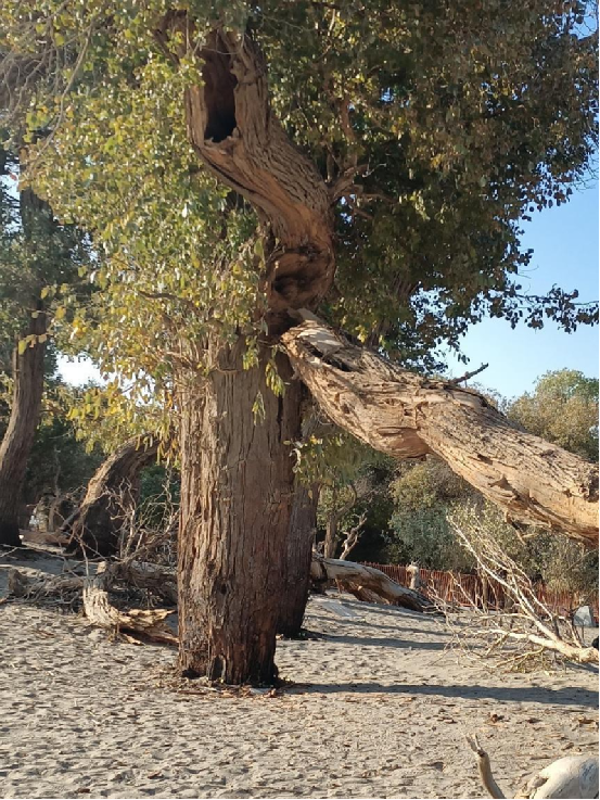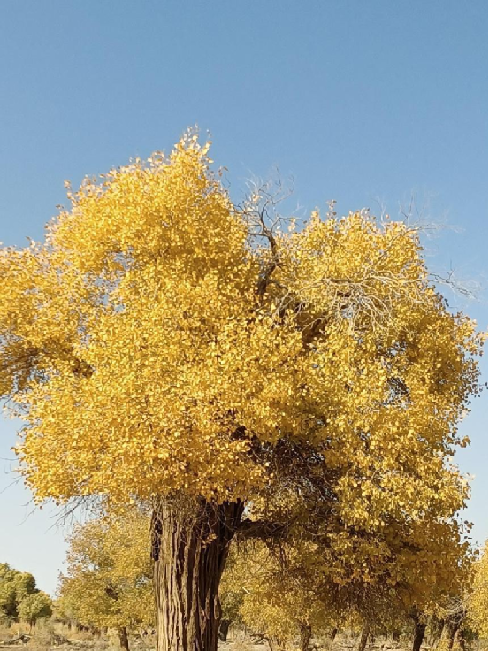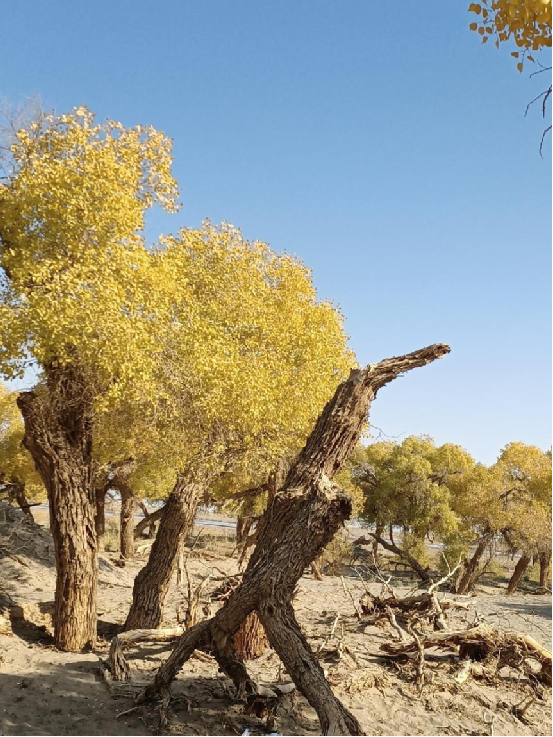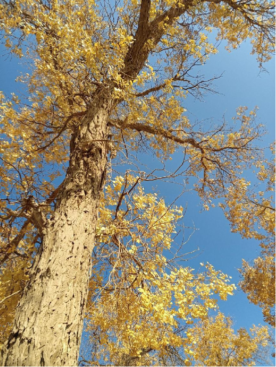 每當(dāng)深秋季節(jié),胡楊樹葉變得一片金黃,形成胡楊秋色,樹影婆娑,奇妙絕倫,賞心悅目。漫步在濃郁的胡楊林中仿佛進入神話般的仙境。茂密的胡楊千奇百怪,神態(tài)萬般。粗壯的幾人難以合抱,挺拔的七、八丈之高,怪異的似蒼龍騰越,似虬蟠狂舞,令人驚奇不已,嘆為觀止。僅就密密匝匝的樹葉,也是風(fēng)采獨有。幼小的胡楊,葉片狹長而細(xì)小,宛若少女嫵媚的柳眉,人們常常把它誤認(rèn)為柳樹;壯齡的胡楊,葉片又變成卵形、闊卵形或三角形,猶如興安嶺的白樺;進入老年期的胡楊,葉片才定型為橢圓形。更令人稱奇者,在同一棵胡楊樹冠的上下層次,還長著不同形狀的葉片,因此,又稱“異葉楊”
