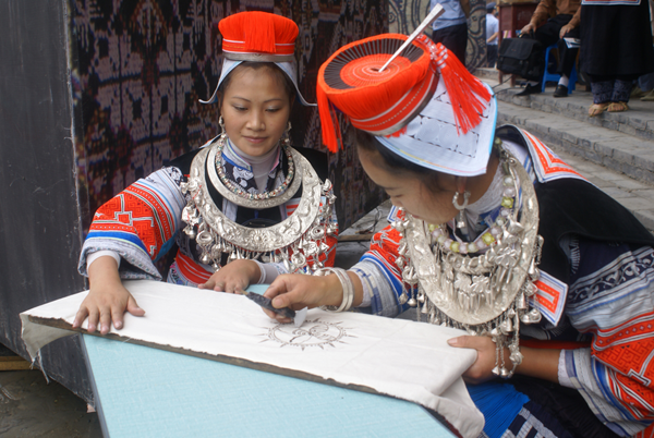 經(jīng)過層層選拔出的100名繡娘在此飛針走線,同秀技藝,展現(xiàn)了少數(shù)民族民間文化獨特的藝術(shù)魅力。