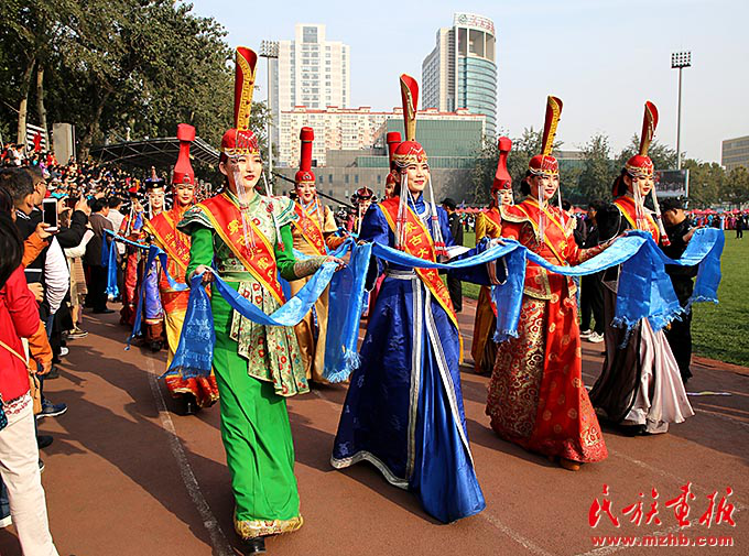 開幕式上,發(fā)起并組織“首屆在京蒙古族那達慕大會”的原中央民族學院民語系77級蒙古語班方隊通過主席臺