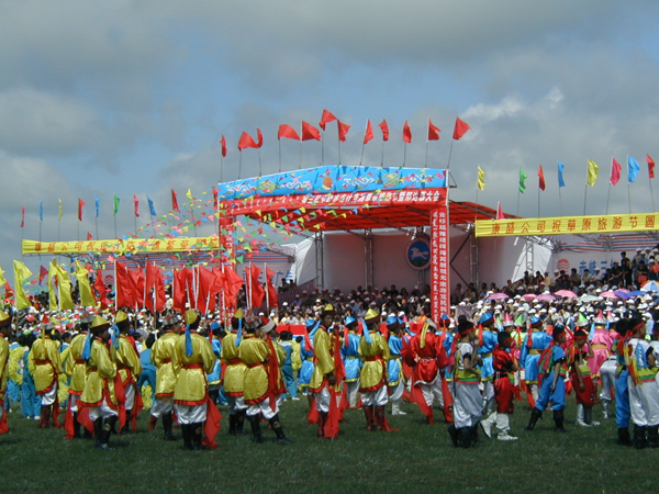 大草原最宜人的時(shí)節(jié)莫過于七八月。屆時(shí),蒙古族牧民們,就會(huì)穿上盛裝,不管路途多遠(yuǎn),男女老少,舉家乘車騎馬,云集到綠海如茵的草原上。世界各地的游人也會(huì)紛至沓來,素日寧?kù)o的草原頓時(shí)沸騰起來,藍(lán)天白云之下,彩旗飄揚(yáng),人流涌動(dòng),羊歡馬叫,呈一派繁榮景象。這就是蒙古民族一年一度的草原盛大節(jié)日——那達(dá)慕大會(huì)隆重開幕。