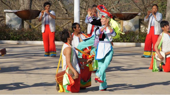 大三弦舞又叫“阿細(xì)跳月”,流傳于云南撒尼和阿細(xì)民間的一種舞蹈。據(jù)傳大三弦舞來源于刀耕火種時(shí)代。跳這種舞時(shí),男子一字排開,彈著三弦或吹著笛子跳。隨著節(jié)奏抬腳踢腿,向前退后、向左向右交換舞步。女青年亦一字排開,腿上的動(dòng)作與男青年一致。不同的是女青年要拍手,原地跳一段節(jié)奏,由左向右轉(zhuǎn)一個(gè)圈,輪回反復(fù)。有時(shí)男子向前沖,女子向后退,富有情趣。