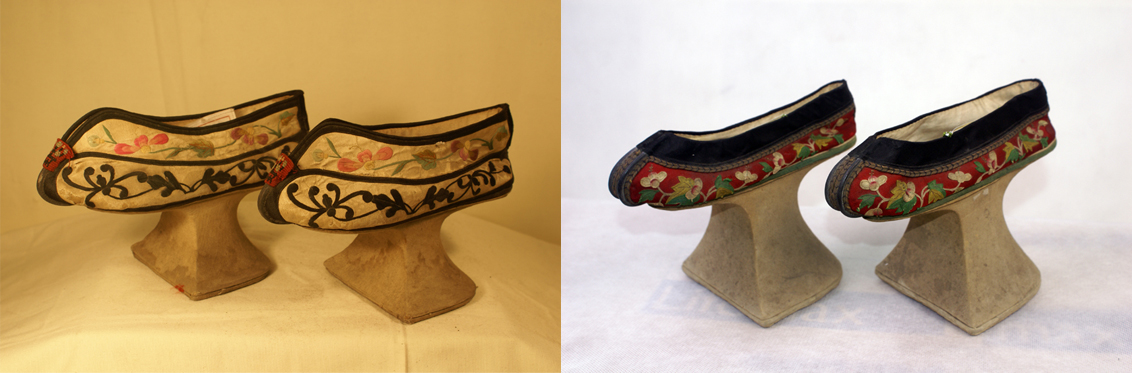 “旗鞋”款式獨(dú)特,是一種高木底繡花鞋,又稱“高底鞋”“花盆底鞋”“馬蹄底鞋”等。其木底高跟一般高5-10厘米,最高可達(dá)25厘米。一般用白布包裹,然后鑲在鞋底中間腳心部位。跟底形狀通常有兩種,一種上敞下斂,呈倒梯形花盆狀。另一種是上細(xì)下寬、前平后圓,其外形及落地印痕皆似馬蹄。“花盆底”和“馬蹄底”鞋由此得名。除鞋幫上飾以蟬蝶等刺繡紋樣或裝飾片外,木跟不著地的部分也常用刺繡或串珠加以裝飾。有的鞋尖還飾有絲線編織的穗子。這種鞋的高跟木底極為堅(jiān)固。
