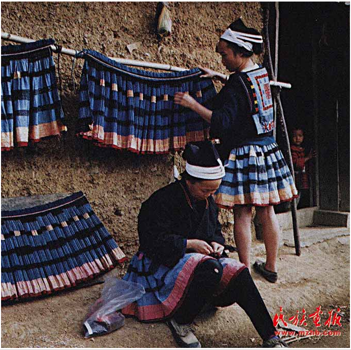 畫好的白布放進盛有牛膠和藍靛的缸里浸染7— 10天,當(dāng)布匹染成深藍色時拿出,再放入盛有草木灰的熱水中,用灰水將粘膏脫去,清水洗凈后晾干,就成了一塊有白色花紋的蠟染布。白褲瑤婦女在白色的花紋上繡上彩色的絲線,再把三幅繡有圖案的布連成一塊4米長的裙布,在裙腳邊上縫上一條手掌寬的黃色蠶絲,最后用2 條棉繩穿過裙頭勒緊,百褶裙就做成了。一條百褶裙從紡線到完成據(jù)說需要兩到三年的時間。