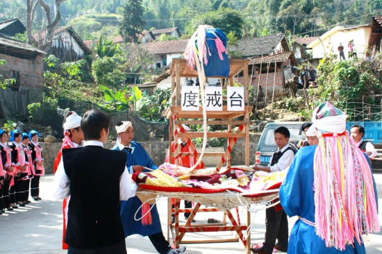 “度戒”臺(tái)(俗稱“巫臺(tái)”,亦稱“神臺(tái)”或“五臺(tái)山”)設(shè)在村子下面的一塊小地里,因這次有兩人“度戒”,便并列設(shè)了兩個(gè)“巫臺(tái)”?!拔着_(tái)”搭得較簡(jiǎn)單,先在場(chǎng)地上打4棵木樁,用四方桌作臺(tái)頂,桌子的4腳分別捆在木樁上,臺(tái)高約4米;“巫臺(tái)”前搭有一架有5個(gè)臺(tái)階的木梯,等“度戒”者送上臺(tái)后便把木梯砍掉;臺(tái)后有一張用大青藤編成的狀如蛛網(wǎng)的大網(wǎng),上面鋪著幾床新被子,約有10人對(duì)稱拉開,等“度戒”師下令,“度戒”者從“巫臺(tái)”上仰面滾落下來(lái)。拉網(wǎng)的人乘“度戒”者墜落進(jìn)網(wǎng)之勢(shì),把他輕放于地上,并將手中之繩速向?qū)Ψ綊仈n,“度戒”師看了其落地的姿勢(shì)可以,此次“度戒”便算成功了。