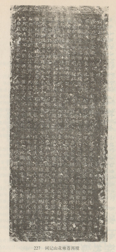 白文碑刻。明楊黼作。景泰元年(1450年)立,原嵌于大理縣作邑鄉(xiāng)慶洞莊圣元寺偏殿前廳北壁,后移至大理縣文化館。碑文14行,陰文正體,從右到左直行書寫。首行為題,其余正文,共13行,每行40字,只第9行41字,末行39字。全詩20節(jié),每兩節(jié)為一聯(lián),共10聯(lián)。前4聯(lián)詠蒼山洱海的自然景色和地勢名勝,后6聯(lián)抒作者之情感。以白語吟誦,優(yōu)美動聽。這是目前保存最為完好的一塊白文碑。傅懋勣、肖雷南在40年代曾根據(jù)郭純?nèi)实淖x音注解此碑,有油印本。石鐘健、楊燦然、徐嘉瑞亦對此碑加以研究。1957年,徐琳、趙衍蓀以郭純?nèi)首x音為本,用國際音標記音,并加翻譯。《民族語文》1 980年第3期載有釋讀文章。