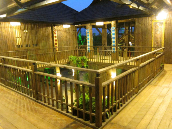 上層近梯處有一露臺(tái),轉(zhuǎn)進(jìn)為長形大房,用竹籬隔出主人臥室并兼重要錢物存儲(chǔ)處。其余為一大敞間,屋頂不甚高,兩邊傾斜,屋檐及于樓板,一般無窗。若屋檐稍高則兩側(cè)開有小窗,后面開一門。樓中央是一個(gè)火塘,日夜燃燒不熄。屋頂用茅草鋪蓋,梁柱門窗樓板全部用竹制成。