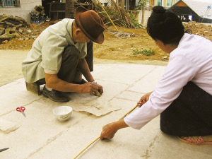 言談間,巖妞把制好的竹環(huán)放入早已畫好的同心圓圖案中的小圓上,只見竹環(huán)大小正好與小圓吻合。巖妞說,圖案外側(cè)的大圓便是擺放棉紙用的。接著,他把手中厚厚的幾張棉紙圍繞著已經(jīng)放入圖案中的竹環(huán)依次擺入,直至擺滿。在同心圓圖案的上側(cè),巖妞還畫了一個寬與同心圓圖案的直徑相符的矩形圖案,把棉紙鋪滿其中。巖妞說,這圖形就是“貢菲”的高度。制作的最后一道程序,是把棉紙用漿糊粘合起來。陰干后,一個“貢菲”就做好了。