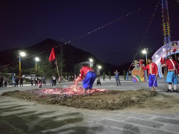 上刀山、下火海,是傈僳族民間的傳統(tǒng)民俗活動,是其傳統(tǒng)節(jié)日“刀桿節(jié)”上的主要表演項(xiàng)目。傈僳族的“刀桿節(jié)”源于一種原始的宗教活動。早期在“刀桿節(jié)”上表演上刀山、下火海的勇士們,都得聽命于巫師。上刀山、下火海之前,有一套繁瑣的宗教祭祀儀式。而且每個上刀山、下火海的勇士身上都要掛上幾十條巫師畫的符咒,使這一活動蒙上了濃厚的宗教色彩。經(jīng)過改革的傈僳族的“刀桿節(jié)”,一般于每年二月初八舉行,屆時,上刀山、下火海就是表演的重要內(nèi)容。上刀山之前,人們首先豎起兩根20 多米長的筆直的松樹桿。在樹桿之間順序捆上36 或72 把鋒利的刀刃向上的鋼刀作梯子。表演開始后,表演者赤手光腳,蹬上梯子頂端,并要做些“蜻蜓倒立”“飛燕迎春”等高難動作。下了刀桿后,勇士們還要赤裸著上身、光著腳跳入熊熊烈火中,甚至用身體滾壓火海,直至炭火逐漸熄滅為止。此后,群眾性的娛樂活動就開始了,唱歌跳舞,呈現(xiàn)出節(jié)日的歡樂氣氛。上刀山、下火海,是經(jīng)過表演者長期的武術(shù)和氣功訓(xùn)練才能完成的。這一活動也表現(xiàn)出傈僳族人民機(jī)智、勇敢、知難而進(jìn)的優(yōu)良品質(zhì)。
