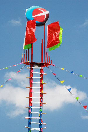 2011年,緬甸傈僳學會在密支那舉辦了第一屆世界傈僳闊時節(jié),第一次將十幾米高的弩弓木雕作為會徽。該木雕高高聳立于密支那郊區(qū)闊時節(jié)會場,還有印有傈僳族徽的紅旗插滿會場四周,高高飄揚,與巨型木雕相互輝映,構成了一個以弩弓木雕為核心,族徽紅旗環(huán)繞的闊時節(jié)會場空間。其內(nèi)其外,傈僳族空間與非傈僳族空間區(qū)隔明顯。
