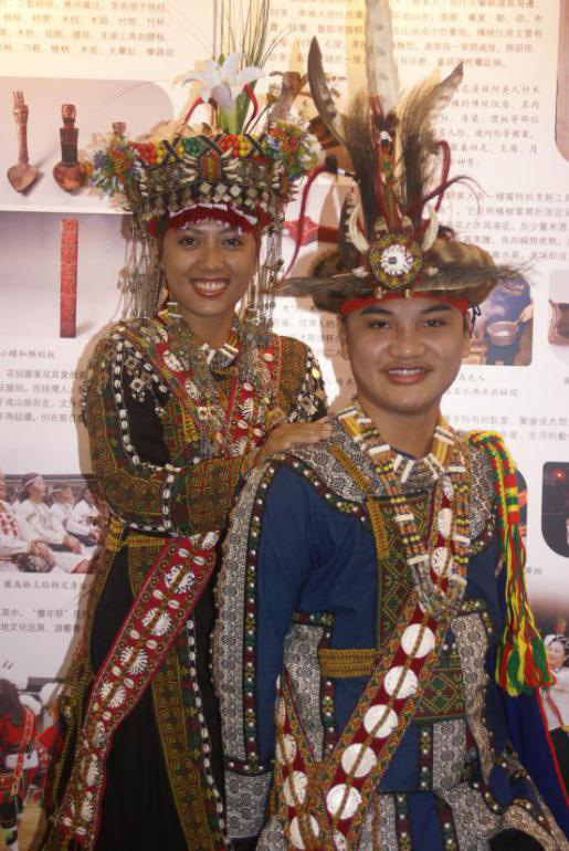 高山族過去以裸身為美,裸形赤足,僅以獸皮、樹皮及植物纖維制作的幅布蔽體,有鑿齒、穿耳的習(xí)俗。接觸漢文化后,逐步形成了男著長衫、女著裙裝的習(xí)慣,衣服除了獸皮和樹皮外,還喜好用自織麻布,飾以彩色紋樣。