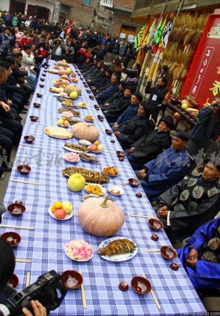 水族以大米為主食,喜愛糯食,此外,水族還種植一些小麥、包谷、小米、紅稗、紅薯及飯豆等雜糧作輔助糧。糯米飯是節(jié)慶主食,也用于祭祀,故又戲稱“鬼米”。水果有李、橙、橘、桃、梨和楊梅,還出產(chǎn)麥冬、杜仲等各種藥材。水族農(nóng)民不善種菜,因而蔬菜品種比較單調(diào),青菜、廣菜及大葉韭菜是最常見的蔬菜。水族比較重視養(yǎng)殖業(yè)和漁業(yè)。水族酸湯極有特色,有辣酸、毛辣酸、魚酸、臭酸等多種。極少有炒菜,一年四季都吃酸湯“火鍋”。即使偶有豆腐、肉或魚,也習(xí)慣加入菜中,煮成一鍋沾蘸水吃。吳茂釗《水族食俗點(diǎn)滴》一文指出,輪流坐莊就是熱情好客的文化表露。水族宴席上以雞、鴨、豬頭為尊,特別喜歡吃魚。水族特色飲食還包括水族特制的豬頭、豬腿、雞、鴨腿、糯米飯、粽粑、魚包韭菜、煮活魚等美食。對(duì)于水族人民而言,“吸煙重于喝茶,飲酒重于吃肉”。水族婚、喪、壽宴簡(jiǎn)易,有“吃酸”的習(xí)俗(圖為水族節(jié)日盛宴。席間的“魚包韭菜”是祭祖儀式的必備之菜。引自民族畫報(bào))。