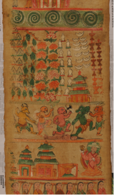 納西族東巴教的長(zhǎng)幅布卷畫,通稱為“神路圖”,它是東巴教繪畫中的巨作。此類畫一般長(zhǎng)10-20米,寬1尺左右,有“古代宗教繪畫第一長(zhǎng)卷”之譽(yù)。文化內(nèi)涵異常豐富,在國(guó)際學(xué)術(shù)界被視為宗教繪畫一絕。如今,此畫已成稀有之物。很少見(jiàn)到尚留存民間的神路圖了?!吧衤贰敝鉃闁|巴為死者評(píng)斷、指點(diǎn)通往神地之路,把他們從地獄的煎熬中解脫超度出來(lái),轉(zhuǎn)生為人,送至神靈之地。在納西族的喪葬和超度亡靈儀式上,根據(jù)神路圖導(dǎo)引死者靈魂進(jìn)入新的生命場(chǎng)是一件極為重要的大事。到時(shí),要把神路圖展開(kāi),眾東巴站于圖旁依次詠誦8冊(cè)《神路圖經(jīng)》,為死者評(píng)斷路徑,導(dǎo)引亡靈穿越鬼地;擺脫惡鬼的種種折磨。在納西族實(shí)行傳統(tǒng)安葬習(xí)俗時(shí),要在安葬場(chǎng)鋪開(kāi)神路圖,把圖上的鬼地部分朝著死者頭部,向東北方向鋪開(kāi)。往東北方向鋪的意思是死者靈魂將回歸東北方向的納西遠(yuǎn)祖之地。把死者靈魂送到“祖先之地”是納西族的古代民俗。各地納西族都有十分詳細(xì)的送魂路線,靈魂返祖地必經(jīng)的每一個(gè)地名都在口傳和寫于東巴經(jīng)的送魂路線中標(biāo)出。其畫面所繪鬼神人三界有數(shù)百個(gè)人神鬼獸的形象和很多具有宗教象征意義的物象,有佛像、神像、各種動(dòng)物神,七八十個(gè)奇禽異獸以及東巴跳神的舞蹈布局,畫卷內(nèi)容以靈魂不滅,因果報(bào)應(yīng),生死輪回等佛教信條為指導(dǎo),用連續(xù)性和富有戲劇性的畫面表現(xiàn)人死后亡魂不滅。