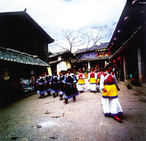 束河、沙河古村鎮(zhèn)到處都是納西族的田園式庭院。大門的裝飾與圍墻和屋脊的裝飾相呼應(yīng),庭院里種了許多植物,高的果樹,矮的花草,就像一個小花園,和田間彌漫著的野薔薇都散發(fā)著令人陶醉的幽香。