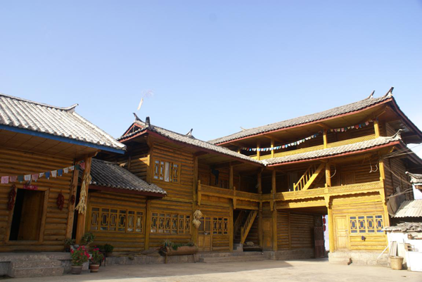 納西族的民居在民國時(shí)期普遍呈“用圓木縱橫相架,層面高至七、八尺,即加椽行,覆之以板,石壓其上”的“木楞房”形制。通常的情況是,在木楞房的正房(祖房)納西族稱為“吉美”(意為母房)中,有一個(gè)納西語稱為“格古魯”的高出地面的灶臺(tái),有家神供其上。中間為火塘,安置大型鑄鐵制三腳架于其上,用以燒水、做飯和取暖。會(huì)客、聚餐和老人就寢都會(huì)在中間的灶臺(tái)上。這種普遍的房屋式樣以及室內(nèi)設(shè)置在廣大山區(qū)和香格里拉三壩、寧蒗永寧目前還普遍流行,當(dāng)然現(xiàn)在的房子已經(jīng)比以前高大寬敞了許多。