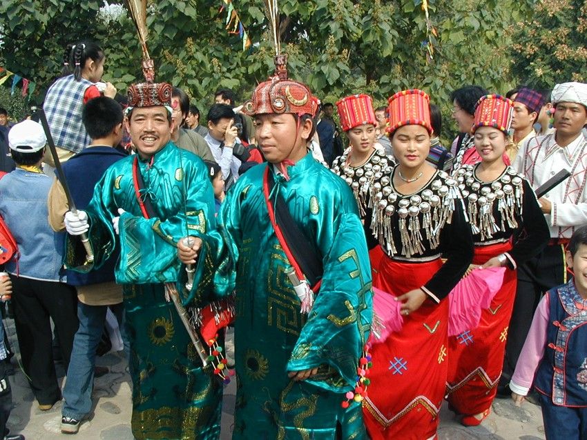 目瑙節(jié):又稱(chēng)“總戈”,景頗語(yǔ)音譯,意思是“大伙跳舞”。目瑙節(jié)是景頗族最盛大的傳統(tǒng)節(jié)日,一般于每年農(nóng)歷正月十五以后的九天內(nèi)擇雙日舉行,節(jié)期三至五天不等。目瑙作為一種大型的群眾性歌舞活動(dòng),由來(lái)已久,歷史上,每逢豐年,出征、凱旋、婚姻嫁娶、敬祭鬼神等重要活動(dòng),均要跳“目瑙”。景頗族的“目瑙縱歌”原來(lái)是一種融宗教和文化習(xí)俗為一體的傳統(tǒng)慶典。隨著社會(huì)的發(fā)展,逐漸演化為各種不同類(lèi)別的“目瑙”。大致有以下幾種:①“歲目瑙”,家庭財(cái)源茂盛,人丁興旺時(shí)舉行;②“布當(dāng)目瑙”,征戰(zhàn)取得勝利時(shí)舉行;③“貢冉目瑙”,同胞兄弟分家自立門(mén)戶(hù)時(shí)舉行;④“騰肯目瑙”,新建房屋住所落成時(shí)舉行;⑤“空然目瑙”貴族家娶親辦婚禮時(shí)舉行;⑥“達(dá)如目瑙”,出征時(shí)舉行;⑦“昔目瑙”,有名望的長(zhǎng)者去世送葬時(shí)舉行;⑧“柱目瑙”,祭奠“木代”神時(shí)舉行。不同類(lèi)別的“目瑙”都有特定的內(nèi)容和表現(xiàn)形式,但有一個(gè)共同點(diǎn)就是整個(gè)過(guò)程都是由“瑙雙”(領(lǐng)舞)隊(duì)和“瑙巴”(表演)隊(duì)組成的舞隊(duì)來(lái)表現(xiàn)和完成的。每逢目瑙節(jié)日,村村寨寨的景頗人身著節(jié)日盛裝,紛紛從四面八方涌入目瑙廣場(chǎng)。廣場(chǎng)上人山人海,氣氛熱烈歡快而不失莊嚴(yán)古樸的特色。廣場(chǎng)中央高豎著四根長(zhǎng)約4米的目瑙柱,亦稱(chēng)雌雄柱,中間兩根為陰,外面兩根為陽(yáng),上面皆繪有精美而富有象征意義的圖案:右邊柱上往往繪以蕨菜花紋,象征團(tuán)結(jié)奮進(jìn);左邊常畫(huà)回紋構(gòu)成若干個(gè)四方形,并涂以不同顏色,表示景頗族的遷徙路線(xiàn);中間兩根柱子之間,交叉著兩把長(zhǎng)刀,為景頗民族驍勇強(qiáng)悍、堅(jiān)強(qiáng)剛毅性格的具體標(biāo)志。目瑙柱的左側(cè)立著一個(gè)方形架子,上層是吹嗩吶的座位;前面掛著一個(gè)兩米長(zhǎng)的大皮鼓和一面直徑一米多的大芒鑼?zhuān)┨钑r(shí)伴奏用。廣場(chǎng)四周用竹籬笆圍起,目的是為了防止野鬼的侵入和牲畜的干擾。舞蹈開(kāi)始時(shí),鼓樂(lè)齊鳴,由兩位德高望重且又熟悉目瑙舞路線(xiàn)的老人身穿大龍袍,頭戴飾有孔雀、野雞羽毛和野豬牙齒的目腦帽,手持長(zhǎng)刀領(lǐng)頭,后面跟著背銅炮和持長(zhǎng)刀的隊(duì)伍,婦女們拿著扇子或彩帕跟在最后,邊歌邊舞,熱鬧非凡。參舞者少則百多人,多則幾千人,從清晨到日暮,以日暮到清晨,通宵達(dá)旦,其間舞者跳累時(shí)可自動(dòng)退場(chǎng)小歇片刻,然后繼續(xù)登場(chǎng)舞蹈。“目瑙縱歌”作為一個(gè)民族的傳統(tǒng)活動(dòng)發(fā)展至今,宗教色彩和類(lèi)別已日益淡化,它已成為景頗族約定俗成的傳統(tǒng)節(jié)日,統(tǒng)稱(chēng)為“統(tǒng)肯(傳統(tǒng))目瑙”并賦予了新的內(nèi)涵,其內(nèi)容和形式都是展示一個(gè)民族的傳統(tǒng)文化,反映今天的新生活和對(duì)未來(lái)的美好向往。