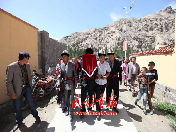 不一會兒,外面熱鬧聲一片。原來是迎親隊伍來了!只見新郎用一塊紅布遮住了臉,在眾人的簇?fù)硐?,緩慢前行。新郎的左右站了三位伴郎,他們一邊走,一邊唱起柯爾克孜族最具代表性的民間口頭文學(xué)“約隆歌”。每走幾步,新郎都會伴著歌聲的旋律和手勢鞠一下躬。新郎和伴郎腰間各系有一塊紅布,他們邊走,后面幾個新娘家的姐妹就要不時抓住他們腰間的紅布,往后拉一下,盡量不讓他們走得太快。其原因是希望他們多唱歌、多鞠躬,以表達(dá)對女方的尊重。