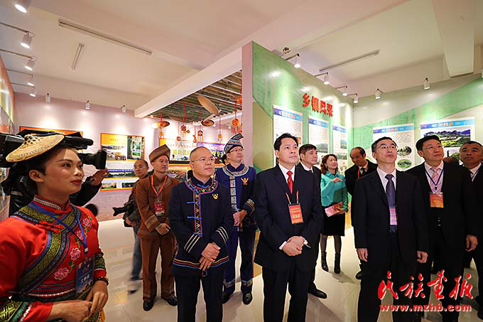 參加環(huán)江毛南族自治縣縣慶活動(dòng)的全國(guó)人大民委、國(guó)家民委祝賀團(tuán)和廣西壯族自治區(qū)代表團(tuán)、河池市代表團(tuán)成員參觀環(huán)江縣經(jīng)濟(jì)社會(huì)發(fā)展成就展
