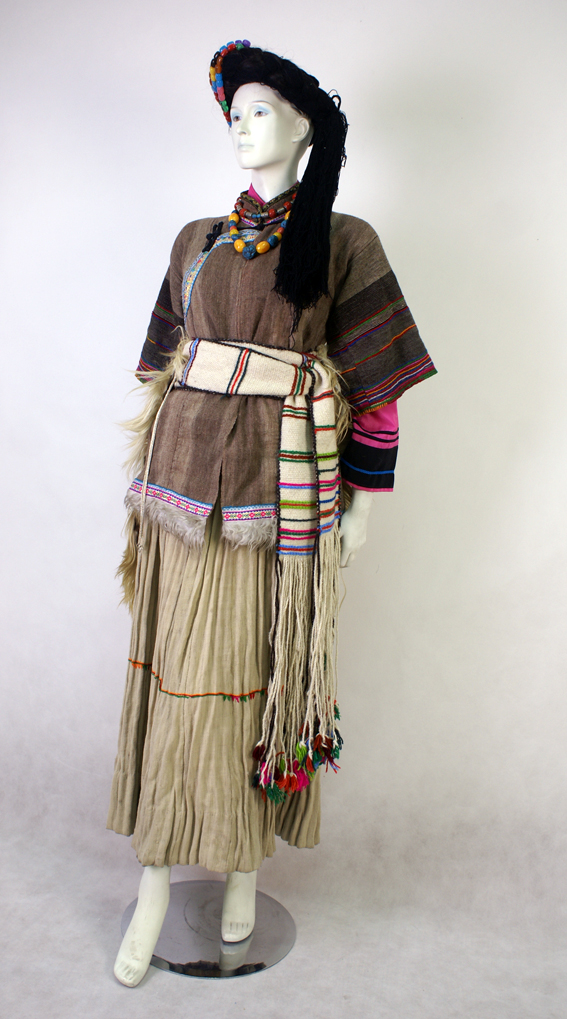 普米族婦女的上衣為黑色、蘭色、白色的開襟短衣,和男子基本一樣,但袖口有花邊,領口用花線繡上吉祥的圖案。下身著百褶筒裙,裙腳邊加一圈紅線,裙襠口加一圈白色厚布,裙腳寬大,縫成褶皺形狀,一般需布匹二丈多。腰間系一根彩帶,彩帶多用山麻或羊毛捻線織成。日常生產生活中,普米族婦女喜歡穿羊皮褂,皮褂有兩種,一種是有袖子的開衫皮褂,一種是不作任何加工縫制的披肩皮褂,一般多用披肩皮褂。青年婦女均穿短上衣,古代是用麻制的,現(xiàn)代大多用棉布;過去多喜歡白色,現(xiàn)在喜用白黑紅等多種顏色;右面開襟,下襟較短,窄袖高領。春天她們穿用條絨縫制、領和衣邊鑲嵌金銀邊的夾衣,稱金邊衣服。