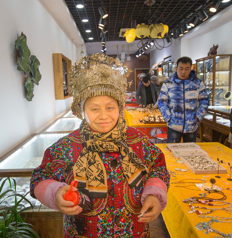 楊玉芬初到西安,是2008年來參加西部洽談會。那一次,她的苗族銀飾一天里賣了幾萬元,讓她十分驚喜。洽談會一結(jié)束,她一出來就直接打的,上去就問司機(jī)你們西安哪里最熱鬧啊?司機(jī)說當(dāng)然是回民街啦!她便讓司機(jī)帶著直奔回民街,下了車,就地找了個(gè)攤位就擺起貨來。沒想到兩個(gè)小時(shí)就賣了3000多元。在西安生意這么好做啊!楊玉芬當(dāng)即決定不走了,鐵下心留在回民街。當(dāng)初,在滿是小吃的回民街上突然出現(xiàn)這么一個(gè)穿著苗服的女子忙來忙去賣銀飾,的確顯得很扎眼。但楊玉芬不把自己當(dāng)外人,很快融入了回民街,生意如同芝麻開花節(jié)節(jié)高,賣的品種越來越多,掙的錢也越來越多。她的攤位從小到大,從街邊升到室內(nèi)。去年,楊玉芬干脆在離回民街入口很近的黃金地段租了一間幾十平米的大店鋪,徹底結(jié)束“練攤”的日子,名正言順開起了“苗奶奶”銀飾店。有著上千種精美銀飾的“苗奶奶”,今天已成為坊上的一道風(fēng)景。