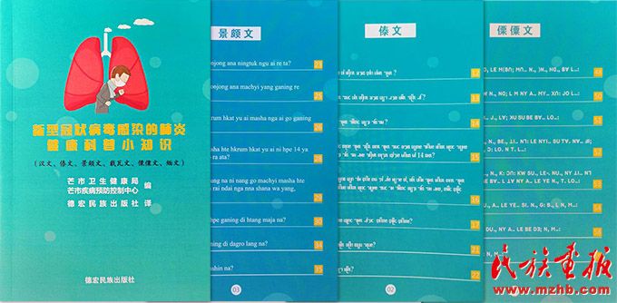 德宏民族出版社出版的《新型冠狀病毒感染的肺炎健康科普小知識(shí)》(漢傣、漢景、漢傈等對(duì)照)5000冊(cè)將免費(fèi)發(fā)放至全州各鄉(xiāng)鎮(zhèn)和邊境一線窗口單位。