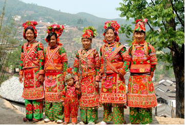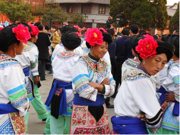 云南巍山彝族回族自治縣各民族如壯麗的織錦,將生活裝扮得五彩繽紛,充滿詩情畫意。其中特別是東山一帶的彝族服飾色彩較為豐富,款式變化多姿,并且以大量的銀制品和刺繡裝飾,制作工藝之精良,堪稱少數(shù)民族服飾一絕。以小孩帽而言,就有魚尾帽、小瓢帽、銀鼓帽、花帽和搭耳帽等數(shù)十種,名目繁多,式樣各異。帽子上都繡有花草、樹葉、龍鳳圖案,鑲嵌著閃亮的銀首飾,十分逗人喜愛。小孩的衣服式樣也很多,大多由紅、藍、綠、白幾種顏色的布料縫制而成,紅綠交織,藍白相襯,非常艷麗。如花朵一般的彝族少女通常頭戴銀鼓帽,墜耳環(huán)、身穿藍領(lǐng)褂,腰系花圍裙,下著綠彩褲,背掛圓裹背。銀鼓帽和繡花鞋做工極為精巧,全套裝飾花團錦簇,恰似一只開屏的孔雀。結(jié)婚后的婦女就不再戴帽子,改為結(jié)發(fā)髻,裹包頭。發(fā)髻一般呈寶塔狀,外裹黑紗和黑布包頭,發(fā)髻上戴“別子”。“別子”其實就是發(fā)卡,均為銀制品,分為四串,每串有兩個燈籠繡球,兩個響鈴和兩尾小魚。包頭巾外再用銀串珠、亮球飾之。上衣著右衽大襟,前短后長、領(lǐng)、袖及襟邊則鑲以多層不同的金銀絲瓣或自繡花紋的多層寬窄不同的花邊。外罩齊腰藍布短領(lǐng)褂,領(lǐng)口上安裝著七個用銀鼓釘湊成五個葉子,狀如葵花形,彝語叫“披巴”的裝飾。領(lǐng)褂四周皆用銀鼓釘鑲邊,共四排,每排36顆。一件領(lǐng)褂上需有兩百多顆銀鼓釘,加上胸前佩戴銀制的“三須”針筒,“菱角吊”串珠和雞心型繡花荷包,整個裝飾真是銀裝素裹,分外嬌嬈。腰間系的圍腰布上,鑲嵌多層金銀絲瓣或自繡圖案的花邊。圖案有串枝蓮、牡丹花、太陽花及鳳戲牡丹、丹鳳朝陽等。無論未婚和已婚婦女,背上都有一個用羊毛搟制而成的圓型繡花裹背,直徑約一尺不等,內(nèi)外兩層,中可承物,上繡兩對太陽花,一大一小,對稱排列。裹背除用作裝飾外,還可保護腰部,既有欣賞價值,又有實用價值,這在巍山彝族服飾中是最為典型的一件飾物。銀鼓帽繡有42朵小花,鑲有96顆銀鼓釘,帽頂插有花一朵或釘有櫻花一束。其帽形如金魚,魚頭魚身為帽,魚尾多岔分為護頸,亦稱為“魚尾帽”。繡花鞋呈船形或鳳頭形,鞋面繡有40余朵小花,紅色中夾有40余片綠葉。如果是新娘鞋,則用紅色或粉色的軟鍛做鞋面,更為講究。