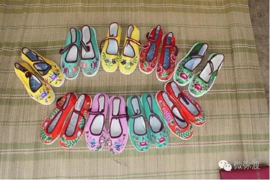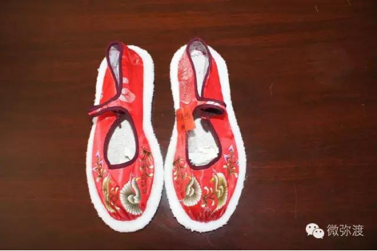 繡花鞋分大口鞋、小口鞋兩種。大口鞋大方素雅,小口鞋古樸艷麗?;佑小胺遐s梅”、“喜鵲登枝”、“獅子滾雪球“、“鳳穿牡丹”和彝族人民結(jié)婚時(shí)候,按當(dāng)?shù)仫L(fēng)俗所需必須穿的“毛邊底”等。這些花樣圖案具有不為時(shí)代變幻所動(dòng)的恒久性質(zhì),蘊(yùn)藏著濃厚的傳統(tǒng)民俗文化。它給予人們的絕不僅僅是絢麗悅目的美感,還是彝民們征服自然,繁衍生息,爭(zhēng)取愛(ài)情和歡樂(lè)的記錄。