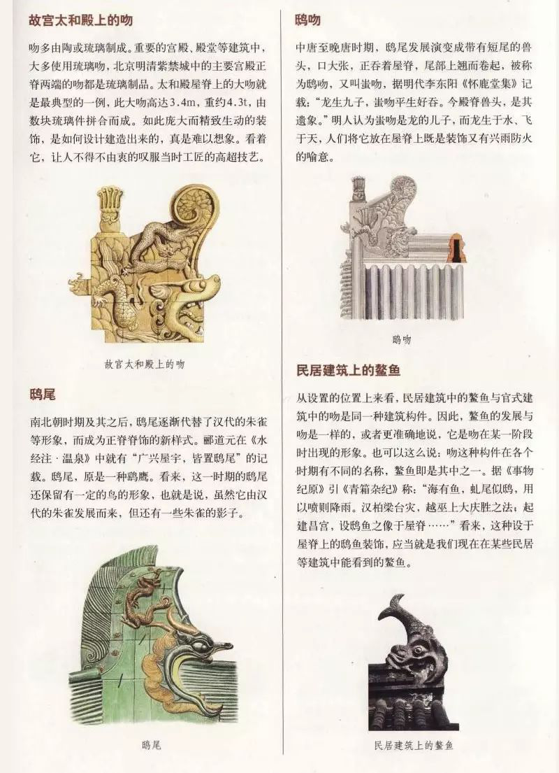 4. 正脊裝飾:在我國古代的很多建筑中,特別是一些等級(jí)較高的建筑中,其屋頂正脊上往往設(shè)有各色裝飾。除了常見的正脊兩端的吻合正脊中心的寶頂外,在正脊的前后兩個(gè)立面上,還會(huì)雕飾或塑有花、草或龍等。