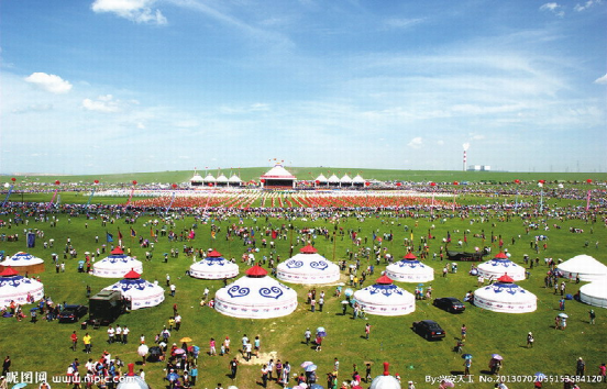 “那達(dá)慕”蒙古語為“娛樂”或“游戲”音譯。為蒙古族的傳統(tǒng)節(jié)日,據(jù)傳始于漢代。一年一度由一旗或數(shù)旗聯(lián)合在農(nóng)歷七八月舉行,每次一至數(shù)日,規(guī)模大小不一。是時正是草原上氣候怡人、綠草如茵、百花盛開、牛羊肥壯的黃金季節(jié)。節(jié)日期間,牧民們身穿節(jié)日新衣,乘馬驅(qū)車,從四面八方匯聚一處。一時草原上五彩旗幟如霞云飄掠,蒙古包如點點珍珠,一片節(jié)日氣象。大會上不僅有傳統(tǒng)的賽馬、摔跤、射箭等競技項目,拔河、藍(lán)球、下蒙古象棋等體育比賽,而且還有豐富多彩的文藝演出和琳瑯滿目的物資貿(mào)易交流。如今那達(dá)慕大會已經(jīng)成為草原上集體育比賽、文化娛樂、經(jīng)濟貿(mào)易、慶賀豐收為一體的綜合性盛大節(jié)日。