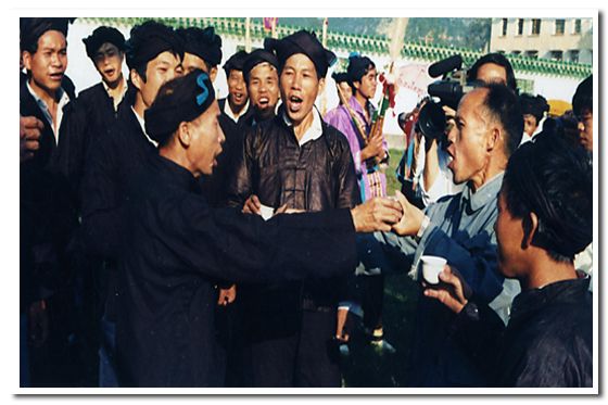 喊酒,是古時(shí)流傳下來的。相傳元寶山下住著一位努老漢,他釀的酒遠(yuǎn)近有名。有一次,努老漢邀請(qǐng)一幫親朋好友到家喝酒,他拿出藏了九九八十一天的糯米甜酒來款待,酒色橙黃,香甜醇厚,大家都夸是好酒。這時(shí)一個(gè)小伙子站起來說:“努老伯釀的酒太好了,現(xiàn)在我們嘴巴吃到了,鼻子聞到了,眼睛看見了,就差耳朵還沒有聽見,我們?yōu)楹尾辉诤染茣r(shí),高喊幾聲,讓耳朵也聽見呢?”大伙都說這做法好,于是大伙起立,手捧酒碗,齊聲高喊三聲“呀――嗚,呀――嗚”(苗語,“好呀”)。喊聲洪亮整齊且有韻律,震撼著木樓,苗家弟兄覺得酒更甜,意更濃,情更切了。從此,“喊酒”的做法便流傳開來,逐漸成為苗家人喝酒助興的一種特有而風(fēng)趣的習(xí)俗。