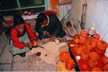 木碗的來源,一是西藏自己生產的,還有一種是云南迪慶生產的,都是從西藏的市場上交換或購買的。西藏林芝地區(qū)的朗縣、察隅,山南地區(qū)的加查、隆子、錯那,阿里地區(qū)的噶爾等地均產木碗。其中尤以錯那生產的“察牙”木碗和噶爾生產的“堆旭”木碗最負盛名。以上木碗的原料選擇樹根或樹瘤車制而成,選料之講究,做工之精細,使好木碗的花紋各異,或磷火紋,或豬鬃紋,或貓頭鷹眼紋,這些木碗都很名貴,與普通木碗之間的價格也很懸殊,一個上等木碗價值10頭牦牛,一般人家是不敢問津的,但也盡量想方設法弄個像樣的,以慰平生。