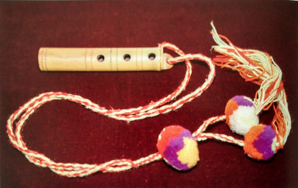 直笛,傈僳語(yǔ)稱之為“迪哩吐”(如圖),多用蘆葦制作,長(zhǎng)約5寸,有4個(gè)圓孔,3孔在正面,1孔在背面,音量較小,音色柔和動(dòng)聽,為青年男女抒情和求愛(ài)必要的工具。
