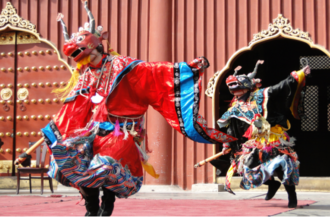 內蒙古地區(qū)的查瑪樂舞已與藏族地區(qū)的“羌姆”明顯不同。隨著藏傳佛教傳入蒙古地區(qū)后,積極地吸收和融合了蒙古族傳統(tǒng)音樂舞蹈和薩滿教神舞的因素后形成了蒙古化的查瑪樂舞。因此,內蒙古地區(qū)的查瑪具有復合型和多元性特點。2008年,查瑪樂舞被列入國家級非物質文化遺產(chǎn)。