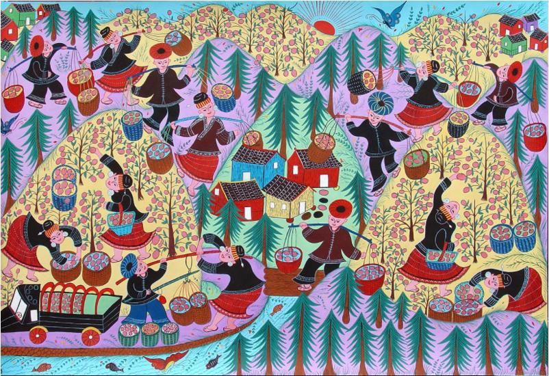 劍河現(xiàn)代民間繪畫(huà)源于傳統(tǒng)的苗族刺繡文化,是苗族刺繡文化的另一種表現(xiàn)形式和藝術(shù)升華。傳統(tǒng)的苗族文化多以服飾、歌舞為載體,并以刺繡及演唱等形式進(jìn)行表現(xiàn)和傳承。早期劍河現(xiàn)代民間畫(huà)即脫胎于具有適用性的苗族刺繡樣稿——剪紙和手繪刺繡粉本,換言之,手繪的苗族刺繡粉本便是劍河現(xiàn)代民間繪畫(huà)的雛形,劍河第一批優(yōu)秀的現(xiàn)代民間畫(huà)作者,即是原當(dāng)?shù)厥掷L粉本的能工巧匠。劍河現(xiàn)代民間繪畫(huà)多以苗族神話傳說(shuō)中的故事情節(jié)和民俗節(jié)日、生產(chǎn)活動(dòng)等內(nèi)容為題材入畫(huà),素材涵蓋自然界花鳥(niǎo)蟲(chóng)魚(yú)及人物、家畜等具體形象,造型稚拙天真,設(shè)色濃艷,對(duì)比強(qiáng)烈。作品傳達(dá)出典型的地域民俗氣息及濃厚的鄉(xiāng)土味,便是其標(biāo)志性特征。