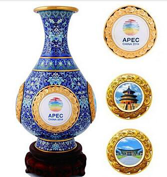 2014年APEC會(huì)議中,作為國禮饋贈(zèng)給各經(jīng)濟(jì)體領(lǐng)導(dǎo)人的三件禮品中就有一件采用景泰藍(lán)工藝,以藏于北京故宮博物院的霽紅釉玉壺春瓶為原型,由中國七位國家級、北京市工藝美術(shù)大師聯(lián)手創(chuàng)作的《四海升平》景泰藍(lán)賞瓶。