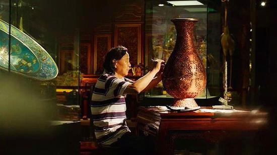 “寶瓶如花放光彩,全憑巧手把花栽,不得白芨花不開,不經(jīng)八卦蝶難來,不受水浸石磨苦,哪能留得春常在?!薄@首民謠惟妙惟肖地唱出了景泰藍(lán)制作過程的繁復(fù)與艱深。