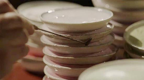 在每一個(gè)點(diǎn)藍(lán)的師傅面前,都由低到高排著一摞白色小碟,里面是摻了水的釉料。細(xì)看去,同樣是紫色,但從深紫到淺紫,竟然能分出十多種層次來。制作精良的景泰藍(lán)作品,對點(diǎn)藍(lán)要求很高。一片花瓣,要描繪顏色的漸變,就要由深入淺潤染幾個(gè)層次,才能表現(xiàn)出花朵特有的美感——這也是景泰藍(lán)的魅力所在,如果一朵花瓣只涂一二種顏色,功夫省了,景泰藍(lán)之美也消失了。