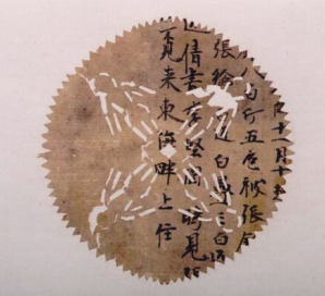 考古人員在阿斯塔那墓葬中還發(fā)現(xiàn)了兩種不同的人形剪紙,一種是剪成并排而立的7人形狀,近似泥俑;另一種在一張寫(xiě)有文字的圓形紙上,剪刻了4個(gè)站立著的人形紋。這兩種人形剪紙?jiān)煨秃?jiǎn)潔,圖案清晰,充滿(mǎn)濃郁的生活氣息。