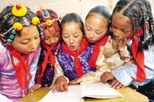 西藏昌都地區(qū)實(shí)驗小學(xué)的學(xué)生們在一起念課文