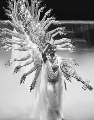 在敦煌舞的動(dòng)作素材積累方面,無論是對(duì)敦煌壁畫舞姿的歸類、整理,對(duì)“敦煌舞特有的S型曲線運(yùn)動(dòng)規(guī)律”的發(fā)現(xiàn),以及“運(yùn)用中國(guó)古典舞蹈的節(jié)奏韻律,把靜止的姿態(tài)與其風(fēng)格統(tǒng)一的動(dòng)作過程結(jié)合起來,形成比較完整的舞蹈運(yùn)動(dòng)和造型體系”,還是在創(chuàng)作層面上《絲路花雨》對(duì)“反彈琵琶”典型壁畫舞姿的發(fā)展,《千手觀音》對(duì)“千手”舞姿造型的無限變化發(fā)展,以及《飛天》超越人體動(dòng)作范圍極限對(duì)“三道彎”典型敦煌舞姿風(fēng)格的強(qiáng)化等,都是敦煌舞在動(dòng)作素材層面的積極建設(shè)和發(fā)展。